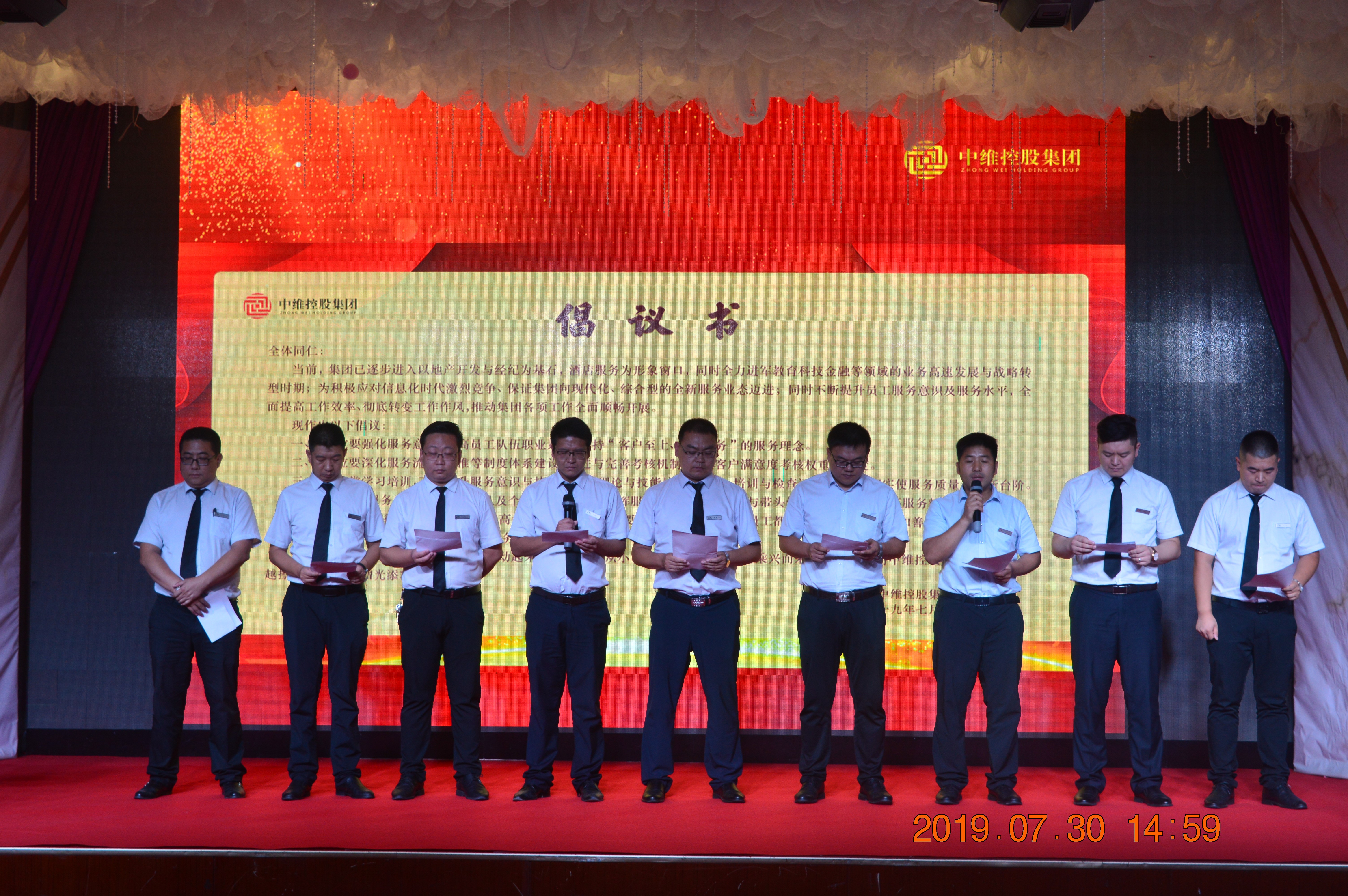 第二,由星雅名都酒店苗建明總經(jīng)理宣讀關于提升服務意識和服務水平的倡議書,并邀請各位領導在倡議書上簽名。各位領導率先垂范,主動踐行公司服務理念,深深激勵著每一位員工。